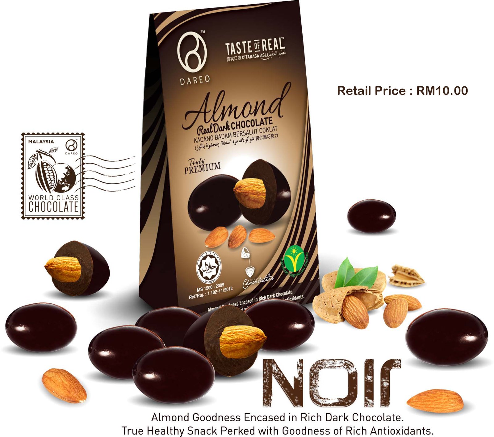 Almond Goodness Encased in Rich Dark Chocolate. True Healthy Snack Perked with Goodness of Rich Antioxidants.