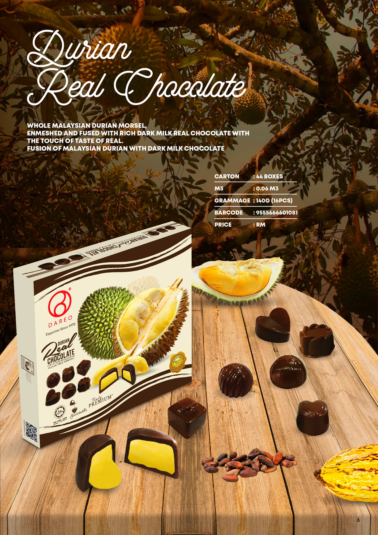 Whole malaysian durian morsel, enmeshed and fused with rich dark milk real chocolate with the touch of taste of real. Fusion of malaysian durian with dark milk chocolate.